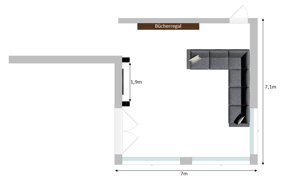 Ich gehe aktuell davon aus, dass der Raum durch die viele Glasfläche zwar hell sein wird, aber akustisch durch Reflexionen auffallen wird. Sicherlich wird das Sofa und das Bücherregel helfen, allerdings lasse ich mich gerne beraten was man noch so alles tun kann. Das der Raum einen nicht unwesentlichen Einfluss auf das Hörergebnis hat war mir von Anfang an klar und konnte ich schon selbst ausprobieren.