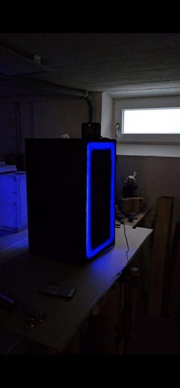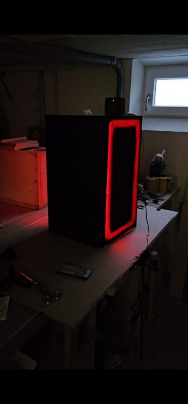 Oben habe ich eine kabellose Handy-Ladefläche eingebaut und beidseitig ein LED-Schlauch für die „Party-Beleuchtung“. Ganz unten ist noch ein Fach, wo man evtl. eine Powerstation einbauen könnte um das Teil auch mobil nutzen zu können.